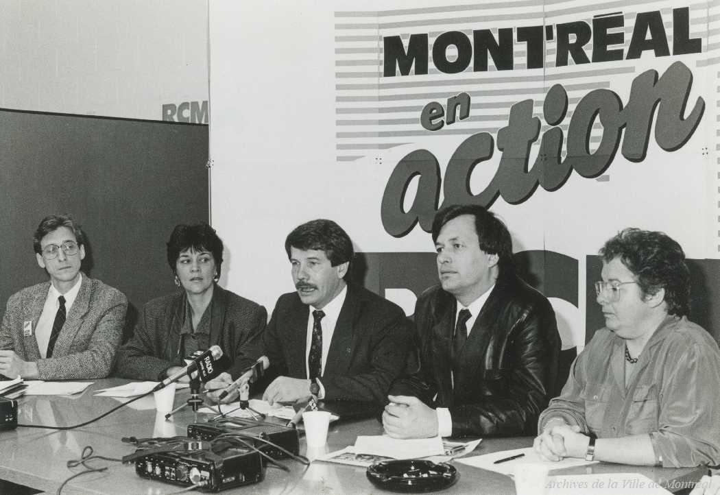 Conférence du presse du RCM, avec Michel Lemay, Diane Martin, Jean Doré, André Lavallée et Léa Cousineau. – 1986. Archives de la Ville de Montréal
