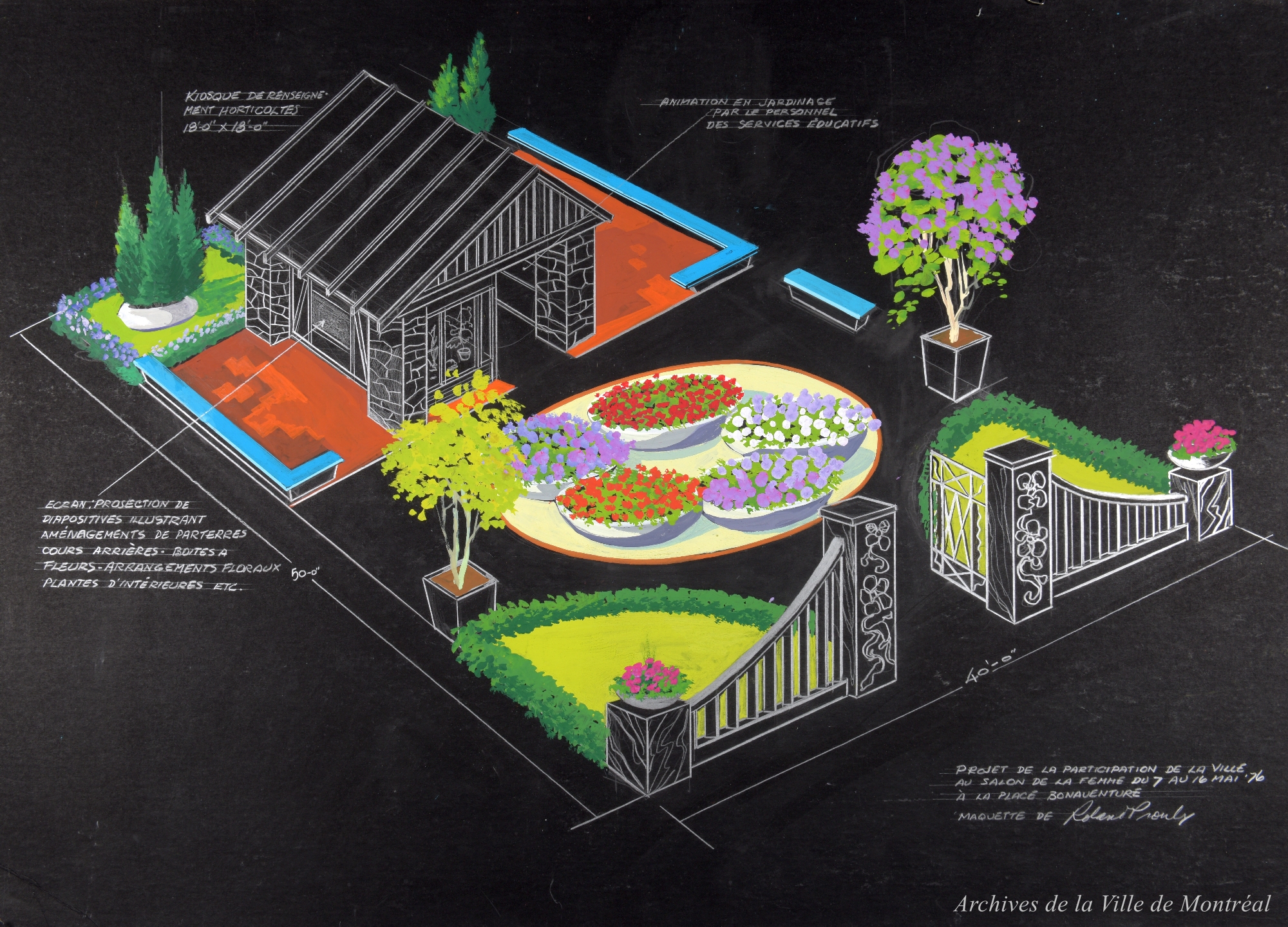 Plan du kiosque de renseignement horticoles pour le projet de participation de la Ville au salon de la femme à la Place Bonaventure. – 1976. / Roland Proulx. P115-01-D015-002. Archives de la Ville de Montréal.