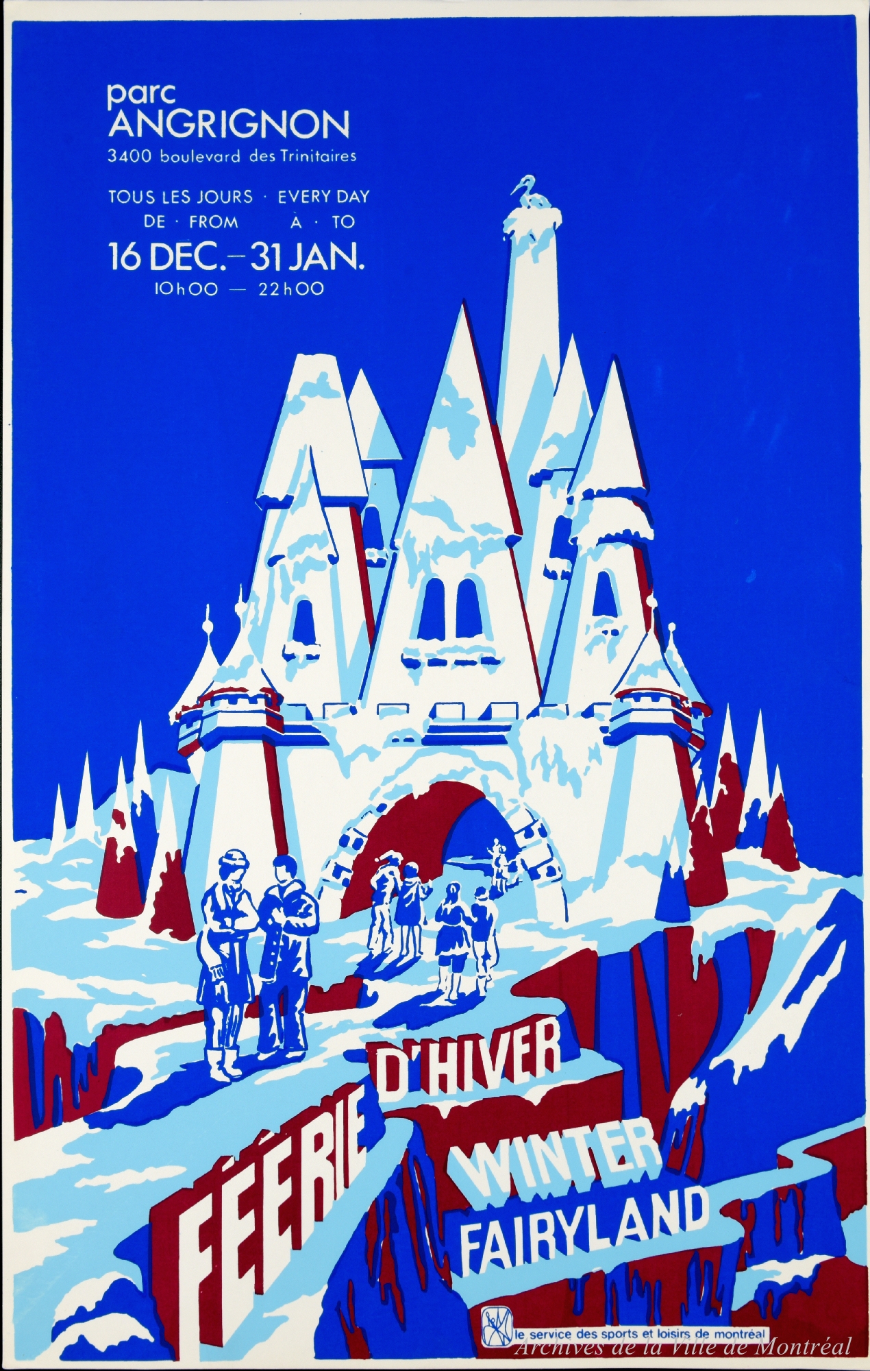 Illustration de l’affiche de la Féerie d’hiver du parc Angrignon. / Roland Proulx – [197-]. P115-01-D008-004. Archives de la Ville de Montréal.