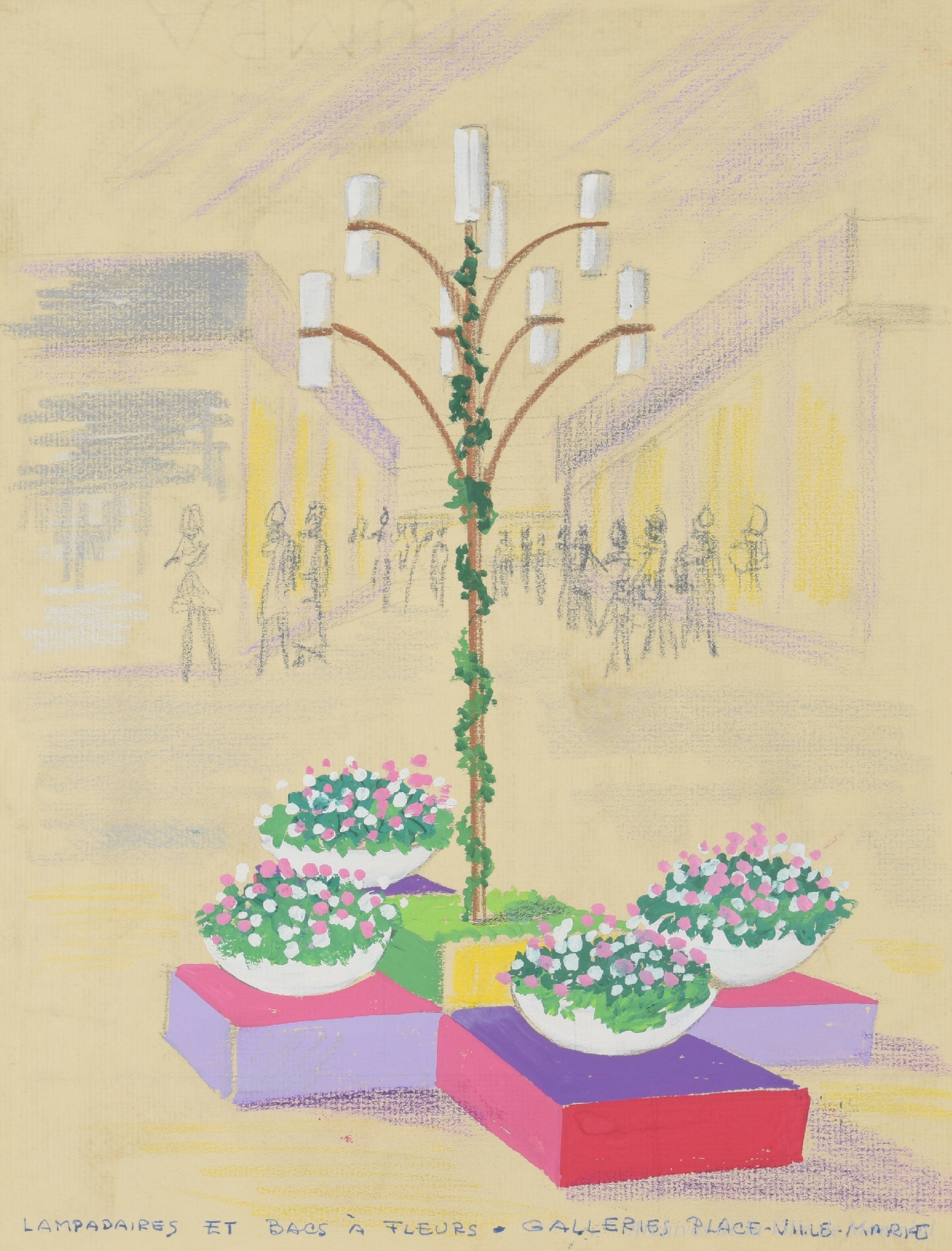 Illustration des lampadaires et bac à fleurs de la Place Ville-Marie. / Roland Proulx. - [1954] - [197-]. P115-01-D012-001. Archives de la Ville de Montréal.