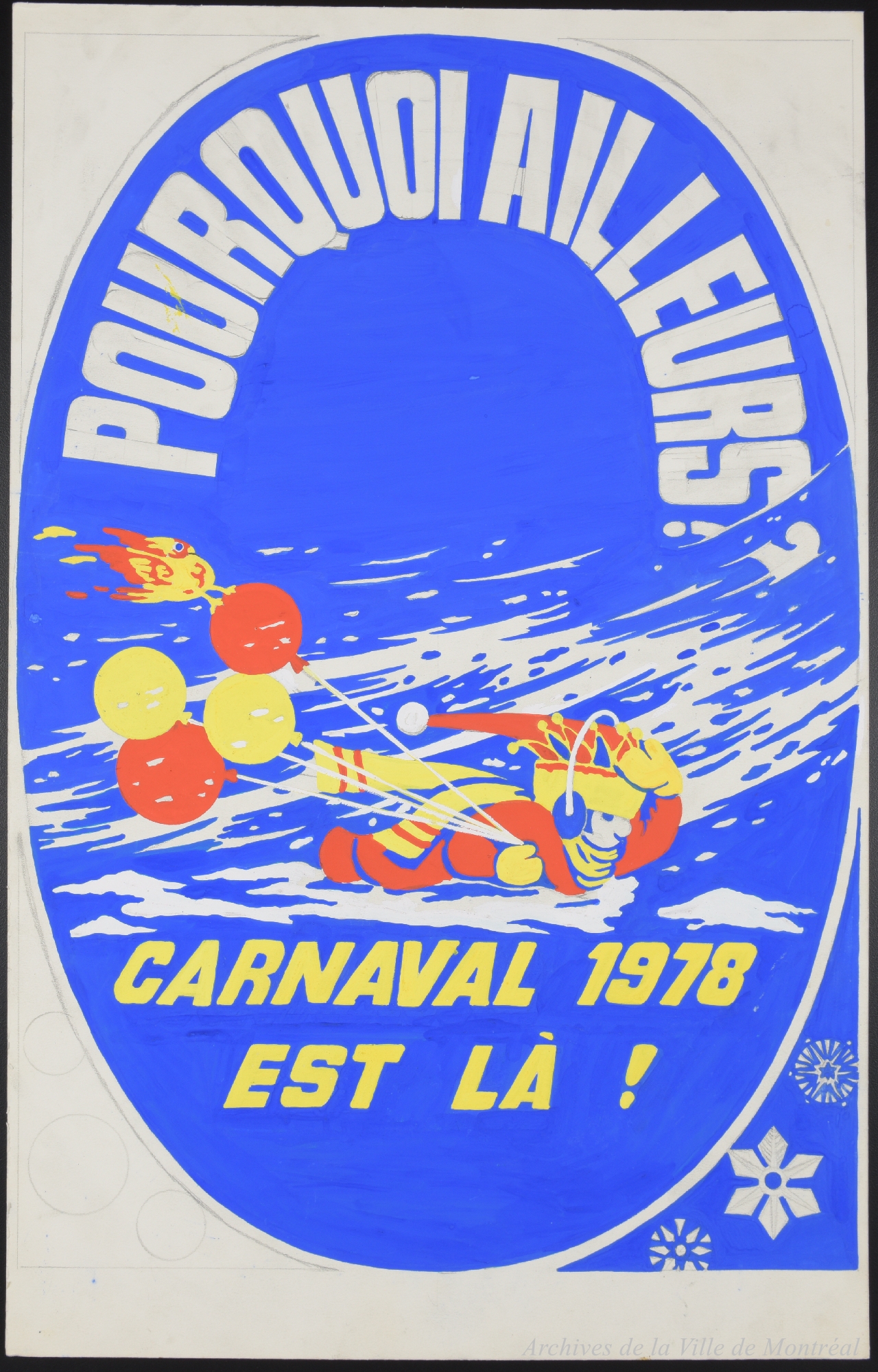 Illustration pour l’événement hivernale : « Pourquoi ailleurs ? Carnaval 1978 est là! ». / Roland Proulx. - [197-]. P115-01-D008-002. Archives de la Ville de Montréal.